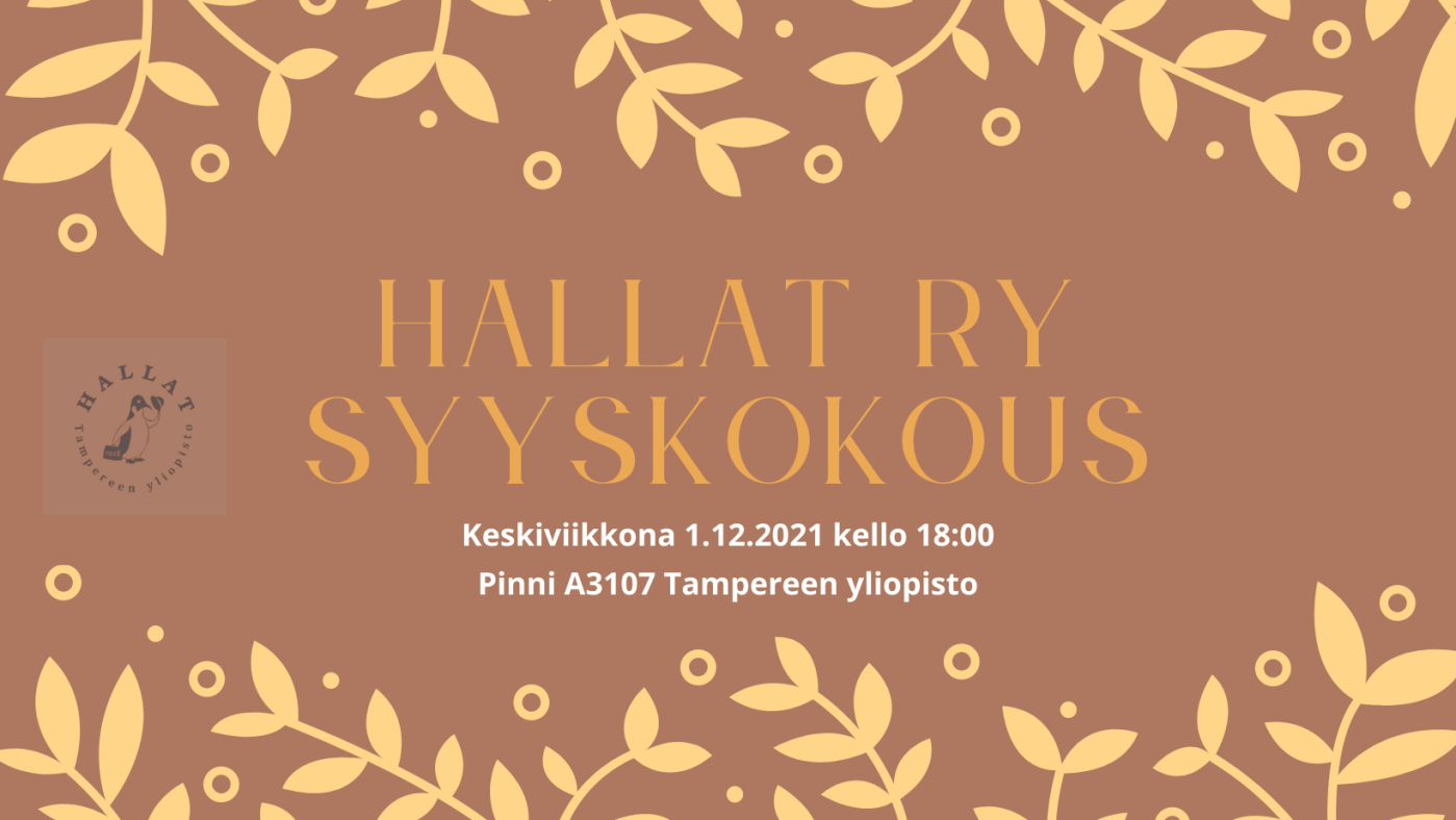 Tampereen yliopiston kunnallistieteiden opiskelijat – Hallat ry:n sääntömääräinen syyskokous pidetään keskiviikkona 1.12.2021 klo 18.00 PinniA 3017 Tampereen yliopisto .